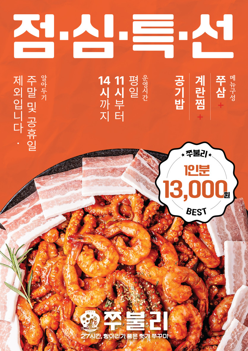식품 분류 쭈불리 입간판 모음 작성자 정보 최고관리자 작성 작성일 2026.03.03 21:18 컨텐츠 정보 12 조회 목록 본문 내용 태그 #음식, #쭈꾸미, #복고적인, #심플한, #한국적/동양적인, #메뉴이미지, #한식, #외식, #식당, #식품, #프랜차이즈, #후킹 관련자료 이전 qr 인쇄 비치용 작성일 2026.03.10 09:49 다음 쭈불리 헛개항아리 입간판 작성일 2026.03.03 21:13 댓글 0 등록된 댓글이 없습니다. 로그인한 회원만 댓글 등록이 가능합니다. 목록