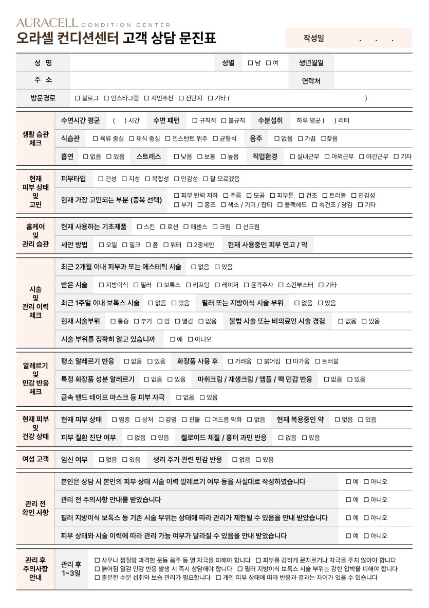 병원 분류 오라셀 컨디션센터 고객 상담 문진표 작성자 정보 최고관리자 작성 작성일 2026.03.27 14:04 컨텐츠 정보 43 조회 목록 본문 내용 태그 #고급스러운, #심플한, #안정적, #신뢰적인, #여성적인, #클래식한, #모던한, #깔끔한, #링크오라, #오라셀, #오라셀컨디션센터, #병원, #문진표, #고객상담, #고객상담문진표, #초진차트, #병원차트, #고객동의서, #안내사항, #초진기록지, #피부관리, #피부과, #미용 관련자료 이전 2026년 수급업체 안전보건수준향상 지원프로그램 포스터 작성일 2026.03.27 14:25 다음 카페 음료 메뉴판 A4&A3 작성일 2026.03.23 22:01 댓글 0 등록된 댓글이 없습니다. 로그인한 회원만 댓글 등록이 가능합니다. 목록