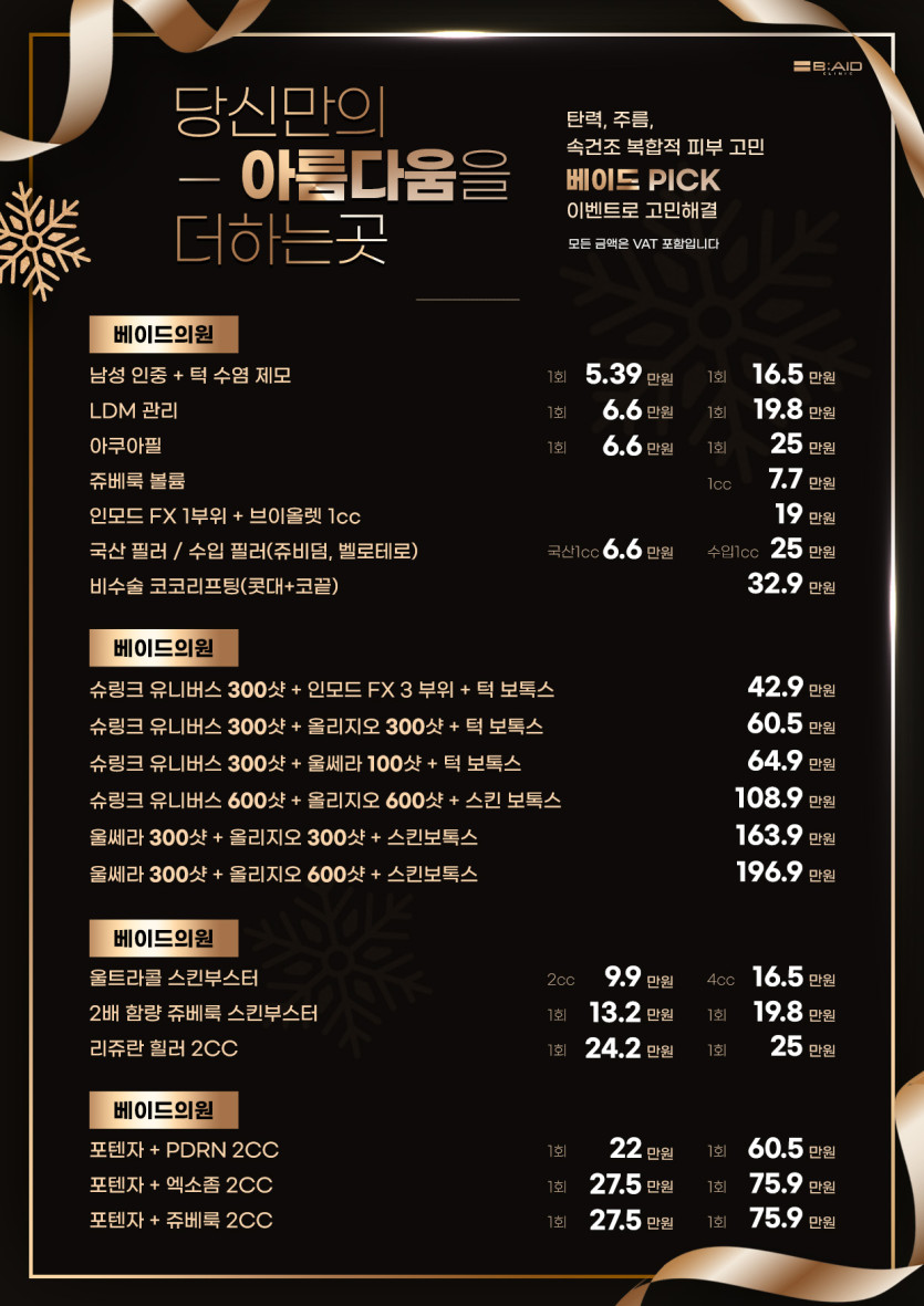병원 분류 가격표 작성자 정보 최고관리자 작성 작성일 2024.12.16 11:15 컨텐츠 정보 14 조회 목록 본문 가격표 태그 #깔끔한, #고급스러운 관련자료 이전 수원그리고의원 1월 진료일정 안내 작성일 2024.12.23 10:59 다음 가격표 작성일 2024.12.16 11:11 댓글 0 등록된 댓글이 없습니다. 로그인한 회원만 댓글 등록이 가능합니다. 목록