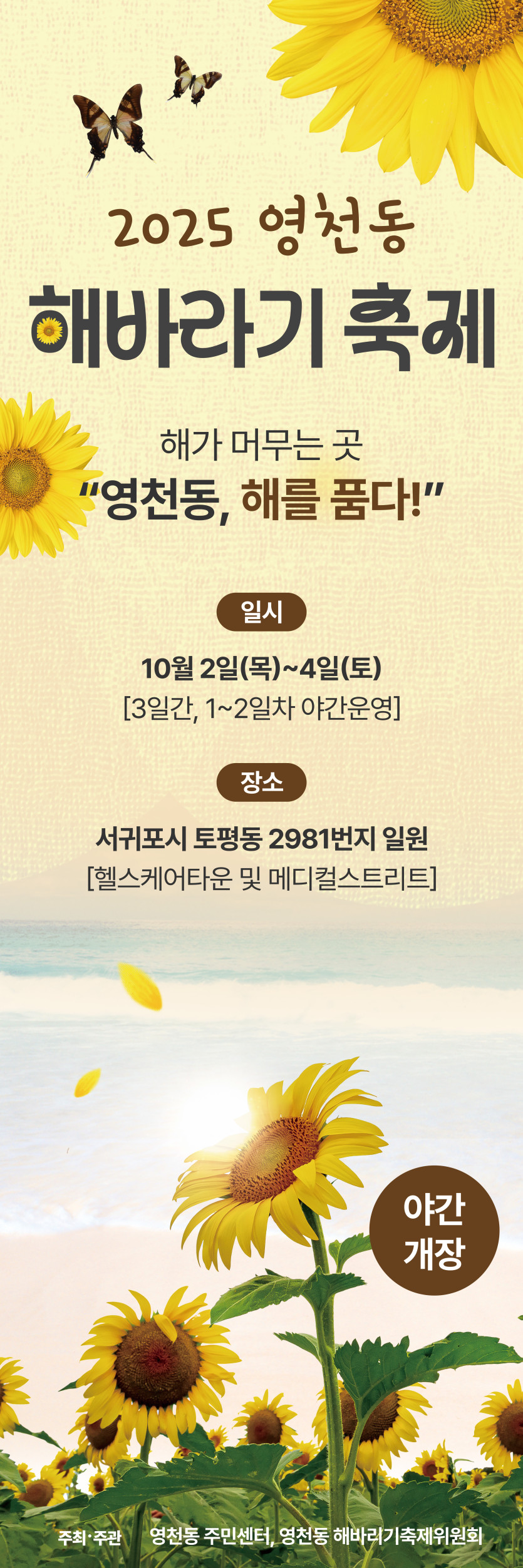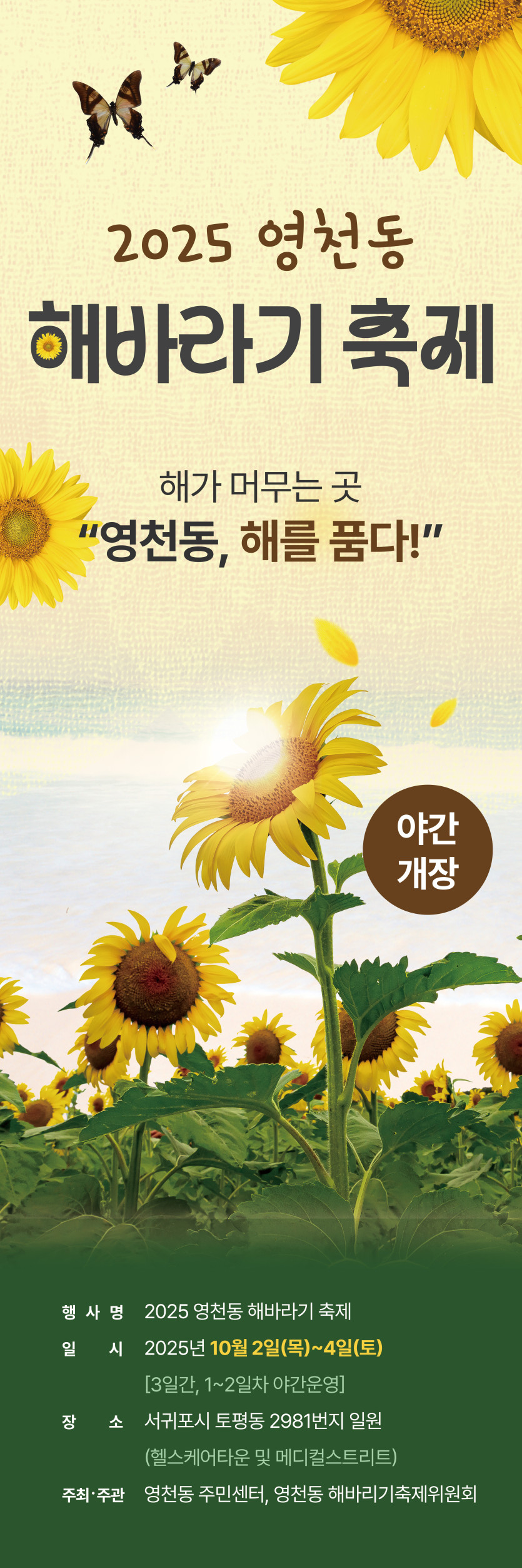 행사 분류 해바라기축제 작성자 정보 최고관리자 작성 작성일 2025.07.03 17:45 컨텐츠 정보 17 조회 목록 본문 ㅁㄴㅇㄹ 태그 #축제 관련자료 이전 PT이벤트 전단지 작성일 2025.07.08 18:22 다음 정성순대 가심비세트 배너 작성일 2025.06.26 18:14 댓글 0 등록된 댓글이 없습니다. 로그인한 회원만 댓글 등록이 가능합니다. 목록