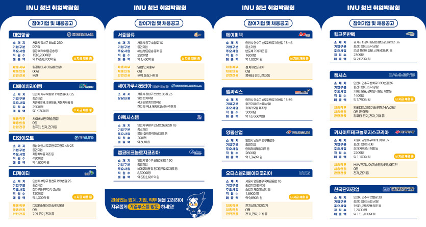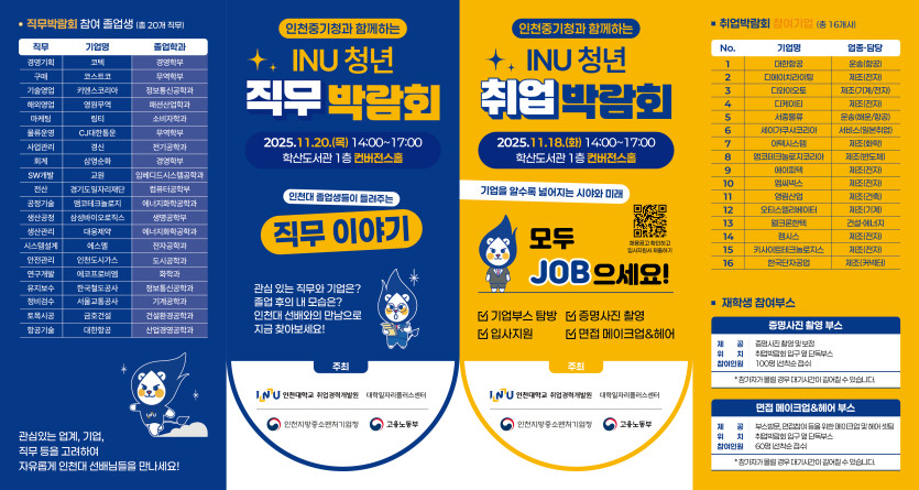 행사 분류 인천대학교 취업박람회 리플렛 작성자 정보 최고관리자 작성 작성일 2025.11.10 19:30 컨텐츠 정보 17 조회 목록 본문 내용 태그 #신뢰적인 관련자료 이전 에덴추모원 리플렛 작성일 2025.11.26 10:57 다음 고구려백제고려 역사지도 작성일 2025.11.05 01:32 댓글 0 등록된 댓글이 없습니다. 로그인한 회원만 댓글 등록이 가능합니다. 목록
